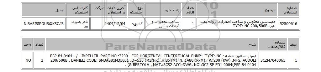 52509616مهندسی معکوس و ساخت اضطراری پروانه پمپ تایپ TYPE: NC 200/500B1ساخت تجهیزات و قطعات یدکیکشوری1404/12/04نادر بصیری پورN.BASIRIPOUR@KSC.IR