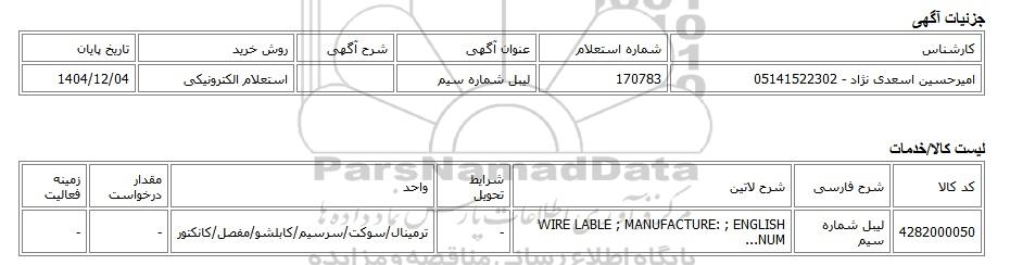 | امیرحسین اسعدی نژاد - 05141522302 | 170783 | لیبل شماره سیم | استعلام الکترونیکی | 1404/12/04 |