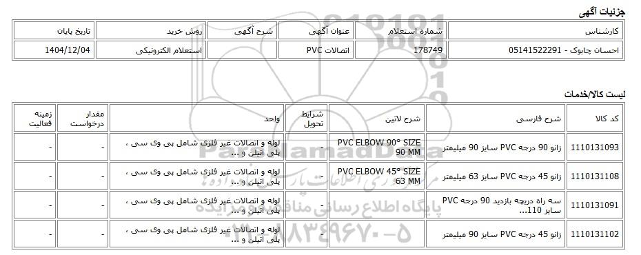| احسان چابوک - 05141522291 | 178749 | اتصالات PVC | استعلام الکترونیکی | 1404/12/04 |