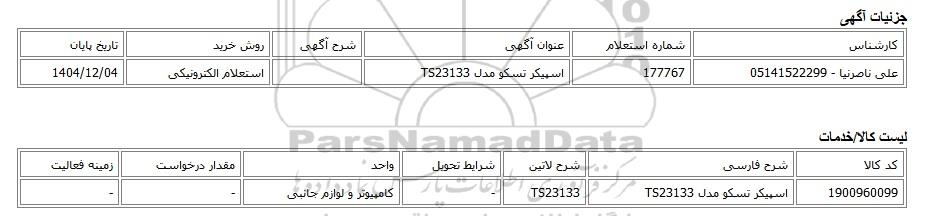 علی ناصرنیا - 05141522299177767اسپیکر تسکو مدل TS23133استعلام الکترونیکی1404/12/04