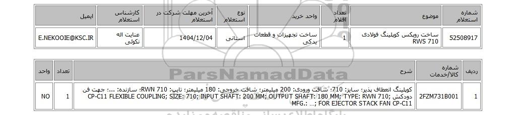 52508917ساخت روپکس کوپلینگ فولادی RWS 7101ساخت تجهیزات و قطعات یدکیاستانی1404/12/04عنایت اله نکوئیE.NEKOOIE@KSC.IR