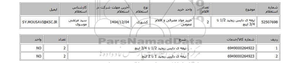 | 52507698 | تیغه ی دایس ریجید 1/2 تا 3/4 اینچ | 2 | خرید مواد مصرفی و اقلام عمومی | کشوری | 1404/12/04 | سید مرتضی موسوی | SY.MOUSAVI@KSC.IR |