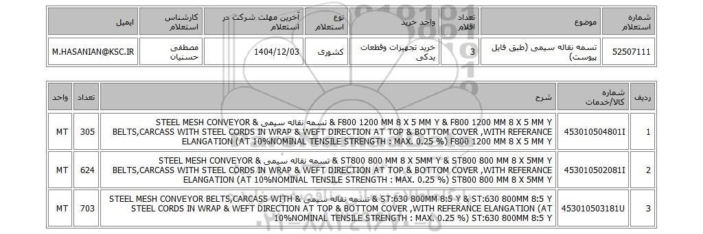 52507111تسمه نقاله سیمی (طبق فایل پیوست)3خرید تجهیزات وقطعات یدکیکشوری1404/12/03مصطفی حسنیانM.HASANIAN@KSC.IR