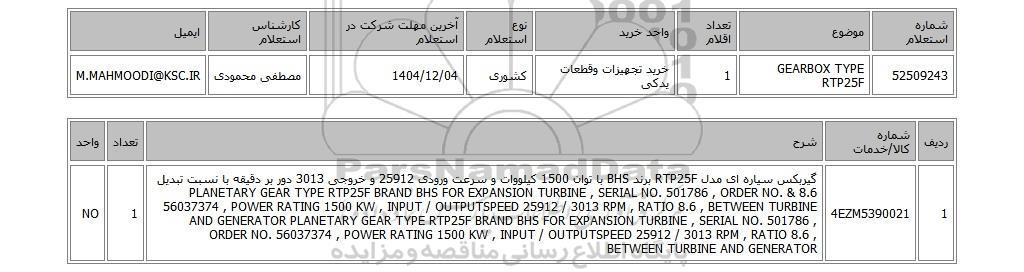 52509243 GEARBOX TYPE RTP25F 1خرید تجهیزات وقطعات یدکیکشوری1404/12/04مصطفی محمودیM.MAHMOODI@KSC.IR