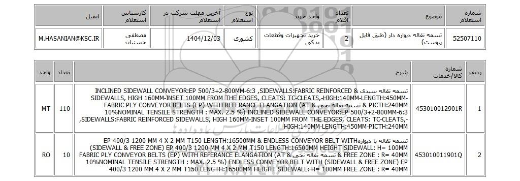 52507110تسمه نقاله دیواره دار (طبق فایل پیوست)2خرید تجهیزات وقطعات یدکیکشوری1404/12/03مصطفی حسنیانM.HASANIAN@KSC.IR
