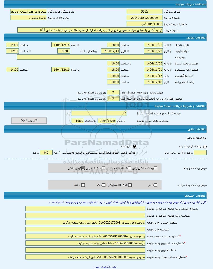 | عنوان مزایده | تجدید آگهی با موضوع مزایده عمومی فروش 3 باب واحد تجاری از مغازه های مجتمع تجاری خدماتی آناآتا -مزایده واحد تجاری - استان آذربایجان غربی | |||