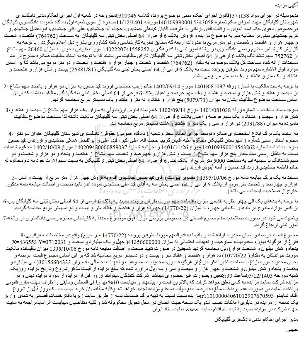 بدینوسیله در اجرای مواد 138و137قانون اجرای احکام مدنی موضوع پرونده کلاسه 0300046مطروحه در شعبه اول اجرای احکام مدنی دادگستری شهرستان گلپایگان جهت اجرای حکم شماره 1401093900015343058مورخه 11/12/1401صادره از سوی شعبه اول دادگاه خانواده دادگستری گلپایگان درخصوص دعوی خانم آمنه آبنوس با وکالت اقای یزدانی به طرفیت آقایان محمدعلی جمشیدی، حجت اله جمشیدی، علی اکبر جمشیدی، ابوالفضل جمشیدی و کریم جمشیدی مبنی بر مطالبه مهریه موضوع مزایده و فروش  پلاک 6 فرعی از 64 اصلی بخش ثبتی سه گلپایگان  به مساحت (764762) هفتصد و شصت و چهار هزار و هفتصد و شصت و دو متر مربع با حدودات اربعه که مطابق نظریه کارشناسی رشته کشاورزی بشرح ذیل اعلام میگردد : با توجه به گزارش کارشناس محترم رسمی دادگستری در رشته امور ثبتی با کد رهگیری 1402220741558252 مورث طرفین دعوی به میزان 26460 سهم مشاع از 752762 سهم ششدانگ پلاک 6 فرعی از 64 اصلی بخش ثبتی سه گلپایگان دارای مالکیت می باشند که با توجه به اسناد مالکیت صادره مندرج در بند مستندات ارائه شده مساحت کل پلاک موصوف به مقدار (764762) هفتصد و شصت و چهار هزار و هفتصد و شصت و دو متر مربع می باشد لذا بر اساس موارد فوق الاشاره سهم مورث طرفین پرونده نسبت به پلاک 6 فرعی از 64 اصلی بخش ثبتی سه گلپایگان (26881/81) بیست و شش هزار و هشتصد و هشتاد و یک متر و هشتاد و یک دسیمتر مربع می باشد.