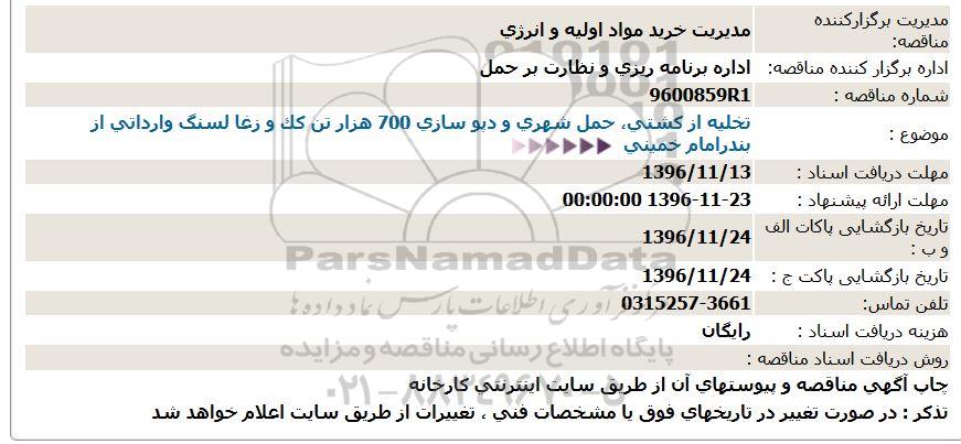 موضوع : تخلیه از کشتی، حمل شهری و دپو سازی 700 هزار تن کک و زغا لسنگ وارداتی از بندرامام خمینی