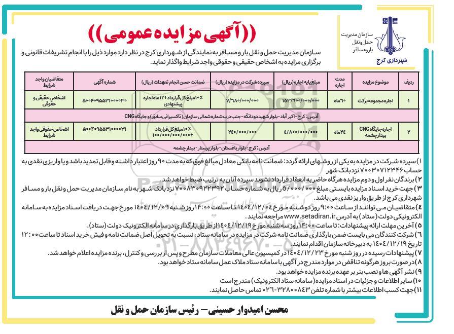 سازمان مدیریت حمل و نقل بار و مسافر به نمایندگی از شهرداری کرج در نظر دارد موارد ذیل را با انجام تشریفات قانونی و برگزاری مزایده به اشخاص حقوقی واجد شرایط وگذار نماید.