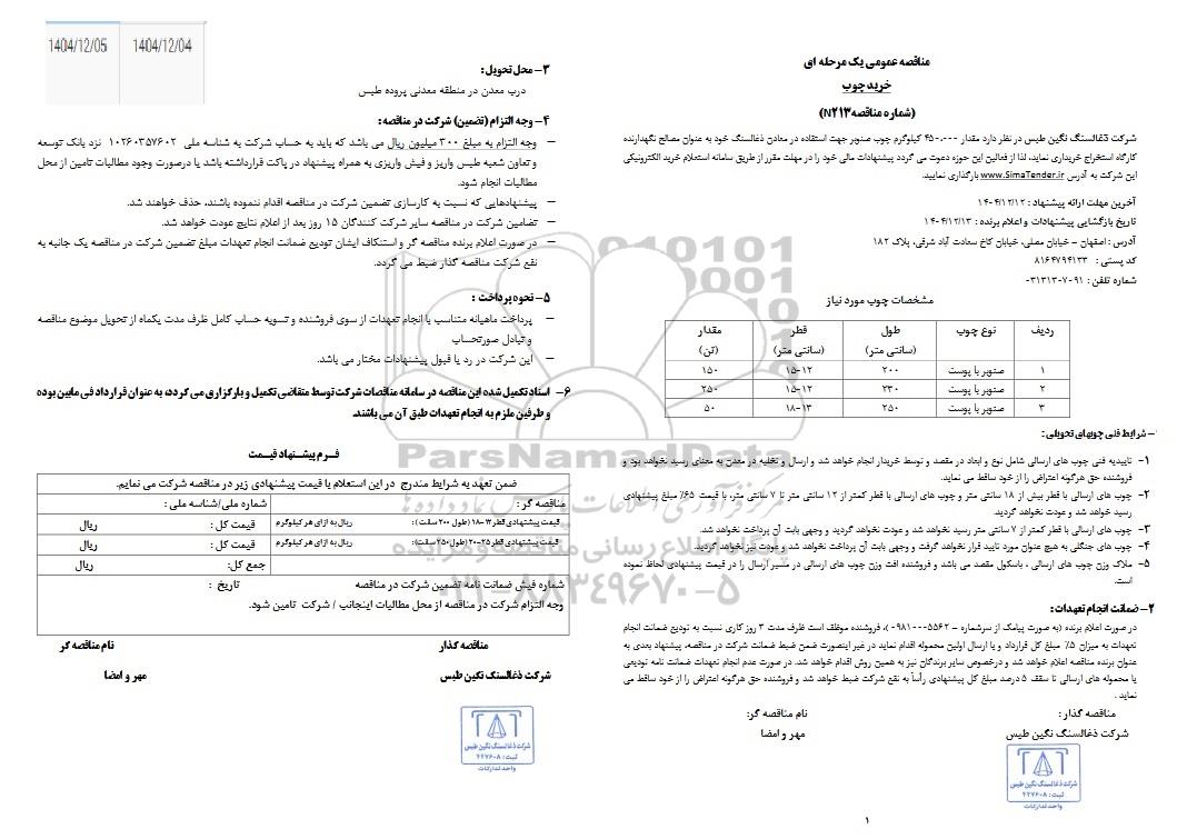 شرکت ذغالسنگ نگین طبس در نظر دارد مقدار 4500000 کیلوگرم چوب صنوبر جهت استفاده در معادن ذغالسنگ خود به عنوان مصالح نگهدارنده کارگاه استخراج خریداری نماید لذا از فعالین این حوزه دعوت می گردد پیشنهادات مالی خود را در مهلت مقرر از طریق سامانه استعلام خرید الکترونیکی این شرکت به آدرس www.SimaTender.ir بارگذاری نمایید.
