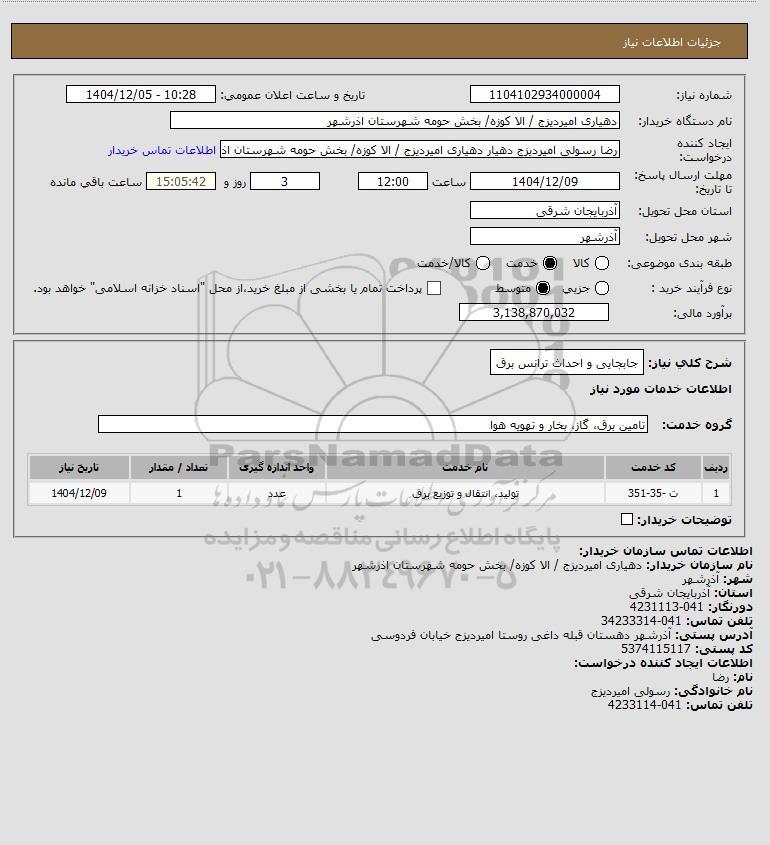 شرح کلی نیاز: جابجایی و احداث ترانس برق