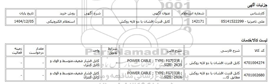 استعلام الکترونیکی کابل قدرت افشان با دو لایه روکش, استعلام الکترونیکی، کابل قدرت افشان با دو لایه روکش