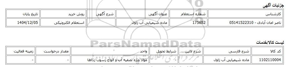 | ناصر امان آبادی - 05141522310 | 175652 | ماده شیمیایی آب ژاول | استعلام الکترونیکی | 1404/12/05 |