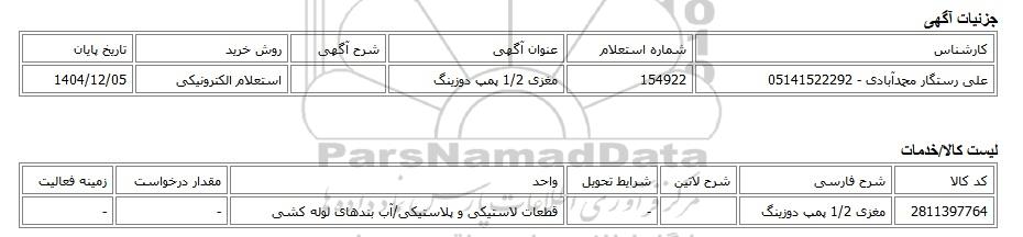 | علی رستگار محمدآبادی - 05141522292 | 154922 | مغزی 1/2 پمپ دوزینگ | استعلام الکترونیکی | 1404/12/05 |