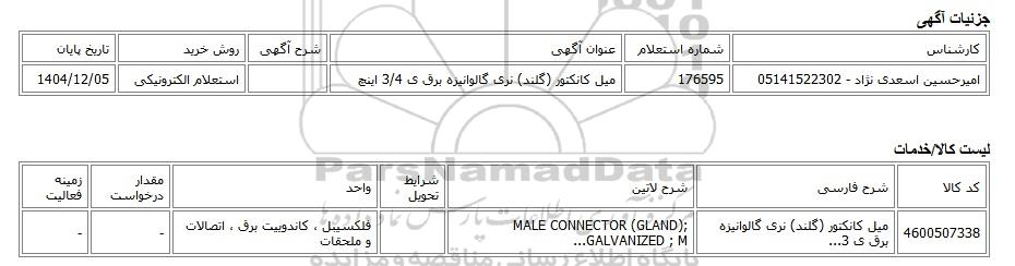 | امیرحسین اسعدی نژاد - 05141522302 | 176595 | میل کانکتور (گلند) نری گالوانیزه برق ی 3/4 اینچ | استعلام الکترونیکی | 1404/12/05 |