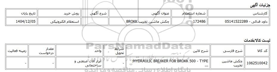 | داود فدائی - 05141522289 | 172486 | چکش ماشین تخریب BROKK | استعلام الکترونیکی | 1404/12/05 |