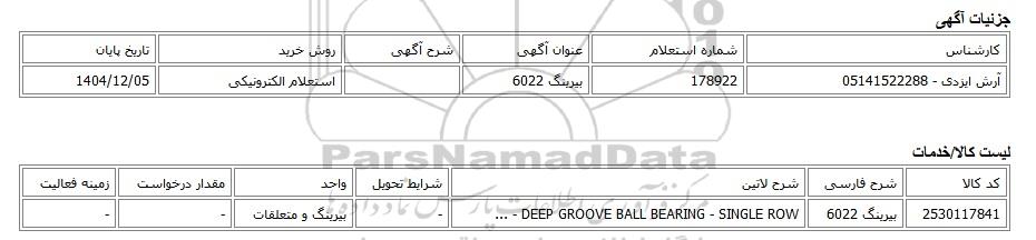| آرش ایزدی - 05141522288 | 178922 | بیرینگ 6022 | استعلام الکترونیکی | 1404/12/05 |