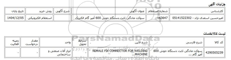 | امیرحسین اسعدی نژاد - 05141522302 | 163647 | سوکت مادگی ثابت دستگاه جوش 600 آمپر گام الکتریک | استعلام الکترونیکی | 1404/12/05 |
