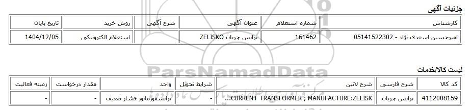 امیرحسین اسعدی نژاد - 05141522302161462ترانس جریان ZELISKOاستعلام الکترونیکی1404/12/05