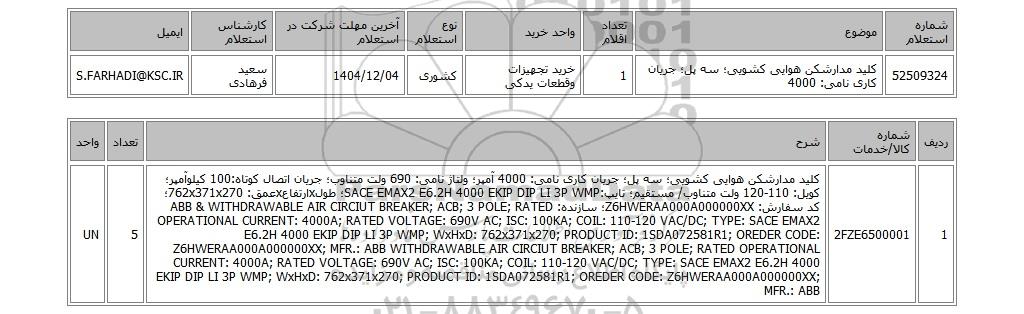 استعلام کلید مدارشکن هوایی کشویی؛ سه پل؛ جریان کاری نامی: 4000, استعلام کلید مدارشکن هوایی کشویی؛ سه پل؛ جریان کاری نامی: 4000