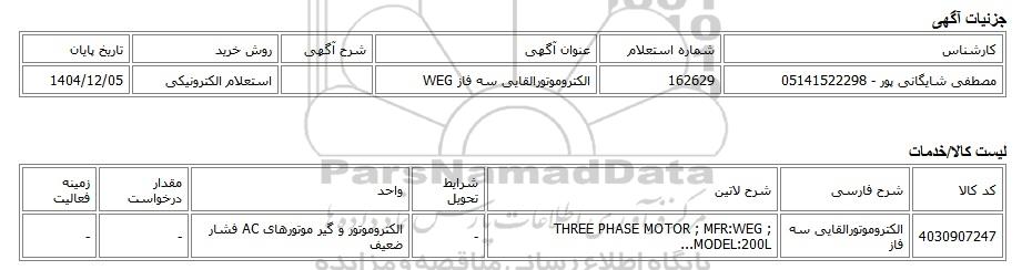 | مصطفی شایگانی پور - 05141522298 | 162629 | الکتروموتورالقایی سه فاز WEG | استعلام الکترونیکی | 1404/12/05 |