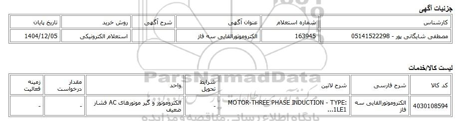 | مصطفی شایگانی پور - 05141522298 | 163945 | الکتروموتورالقایی سه فاز | استعلام الکترونیکی | 1404/12/05 |