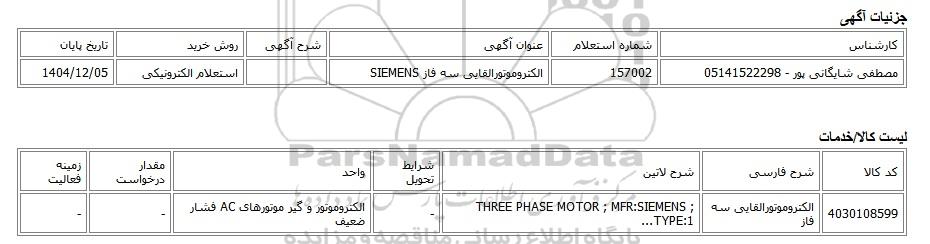 | مصطفی شایگانی پور - 05141522298 | 157002 | الکتروموتورالقایی سه فاز SIEMENS | استعلام الکترونیکی | 1404/12/05 |