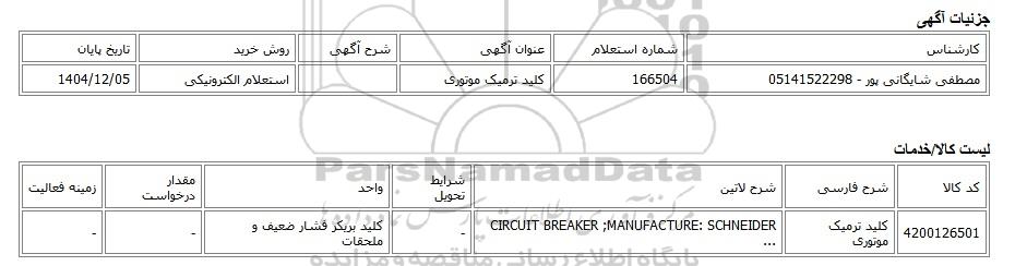 | مصطفی شایگانی پور - 05141522298 | 166504 | کلید ترمیک موتوری | استعلام الکترونیکی | 1404/12/05 |