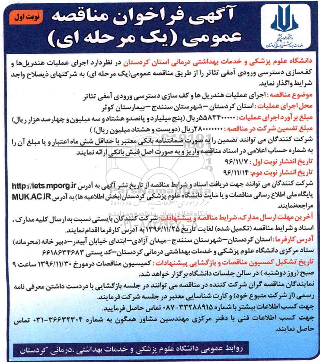 دانشگاه علوم پزشکی و خدمات بهداشتی درمانی استان کردستان در نظر دارد اجرای عملیات هندریل ها و کف سازی دسترسی ورودی آمفی تئاتر را از طریق مناقصه عمومی یک مرحله ای به شرکت های ذیصلاح واجد شرایط واگذار نماید.