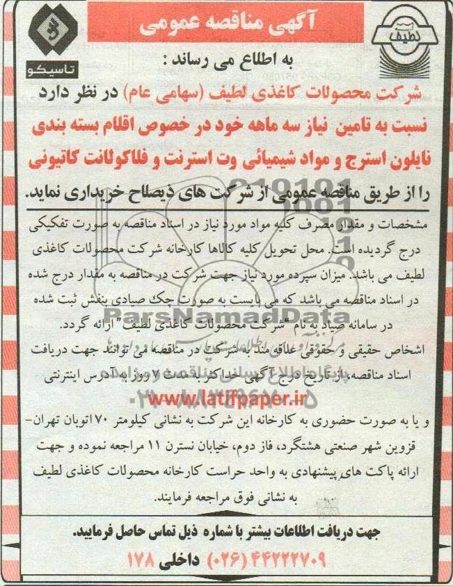 شرکت محصولات کاغذی لطیف (سهامی عام) در نظر دارد نسبت به تامین نیاز سه ماهه خود در خصوص اقلام بسته بندی نایلون استرج و مواد شیمیائی وت استرنت و فلاکولانت کاتیونی را از طریق مناقصه عمومی از شرکت های ذیصلاح خریداری نماید.