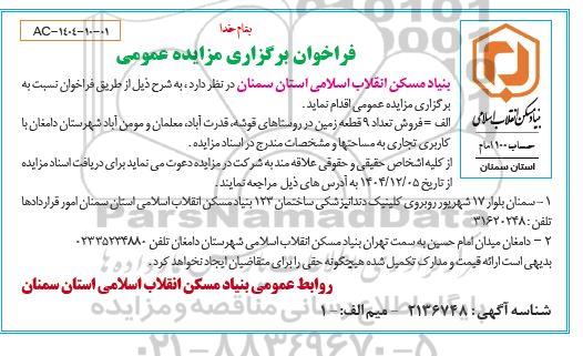 بنیاد مسکن انقلاب اسلامی استان سمنان در نظر دارد، به شرح ذیل از طریق فراخوان نسبت به برگزاری مزایده عمومی اقدام نماید.