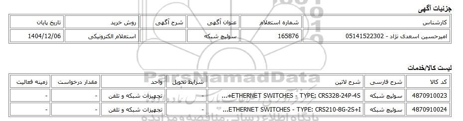 | امیرحسین اسعدی نژاد - 05141522302 | 165876 | سوئیچ شبکه | استعلام الکترونیکی | 1404/12/06 |