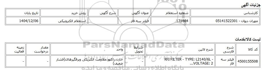 | مهران دیوان - 05141522301 | 171884 | فیلتر سه فاز | استعلام الکترونیکی | 1404/12/06 |