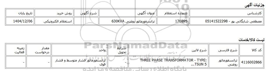 | مصطفی شایگانی پور - 05141522298 | 176895 | ترانسفورماتور روغنی 630KVA | استعلام الکترونیکی | 1404/12/06 |