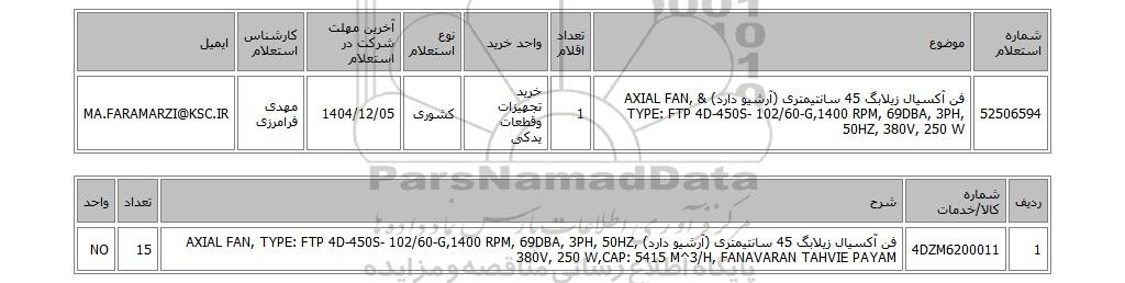 52506594فن آکسیال زیلابگ 45 سانتیمتری (آرشیو دارد) & AXIAL FAN, TYPE: FTP 4D-450S- 102/60-G,1400 RPM, 69DBA, 3PH, 50HZ, 380V, 250 W1خرید تجهیزات وقطعات یدکیکشوری1404/12/05مهدی فرامرزیMA.FARAMARZI@KSC.IR