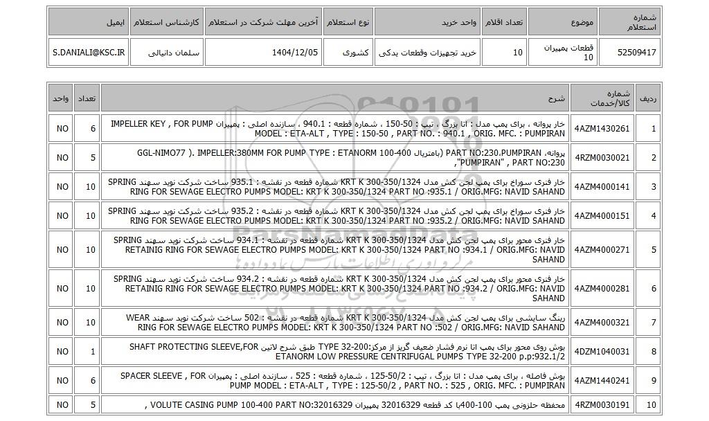 | 52509417 | قطعات پمپیران 10 | 10 | خرید تجهیزات وقطعات یدکی | کشوری | 1404/12/05 | سلمان دانیالی | S.DANIALI@KSC.IR |