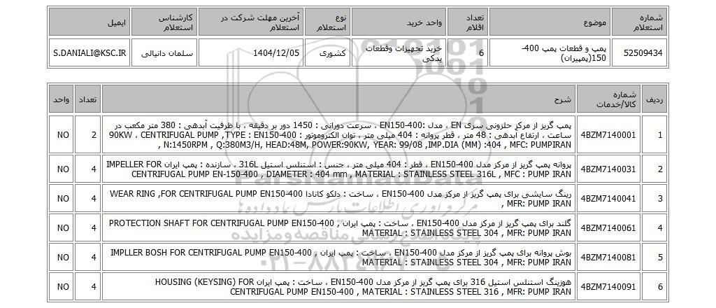 | 52509434 | پمپ و قطعات پمپ 400-150(پمپیران) | 6 | خرید تجهیزات وقطعات یدکی | کشوری | 1404/12/05 | سلمان دانیالی | S.DANIALI@KSC.IR |