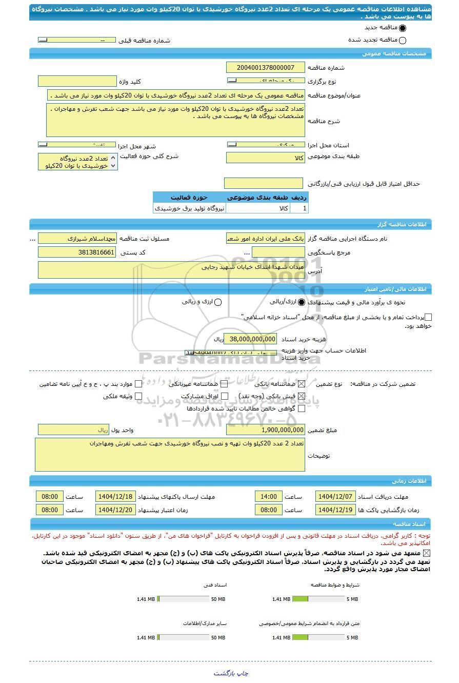 شرح مناقصهتعداد 2عدد نیروگاه خورشیدی با توان 20کیلو وات مورد نیاز می باشد جهت شعب تفرش و مهاجران . مشخصات نیروگاه ها به پیوست می باشد .