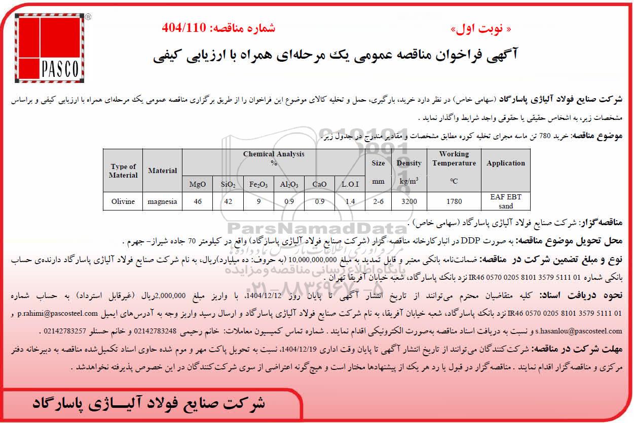 شرکت صنایع فولاد آلیاژی پاسارگاد (سهامی خاص) در نظر دارد خرید، بارگیری، حمل و تخلیه کالای موضوع این فراخوان را از طریق برگزاری مناقصه عمومی یک مرحله ای همراه با ارزیابی کیفی و براساس مشخصات زیر، به اشخاص حقیقی یا حقوقی واجد شرایط واگذار نماید.