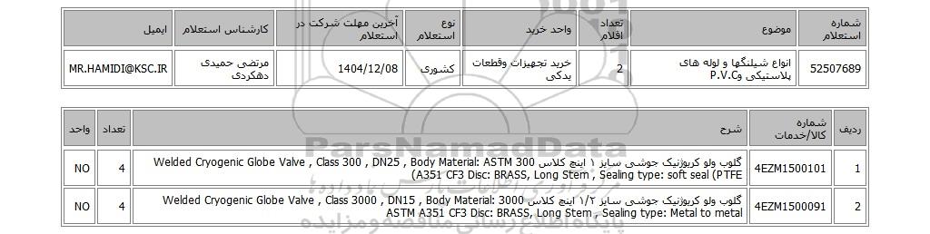 | 52507689 | انواع شیلنگها و لوله های پلاستیکی وP.V.C | 2 | خرید تجهیزات وقطعات یدکی | کشوری | 1404/12/08 | مرتضی حمیدی دهکردی | MR.HAMIDI@KSC.IR |