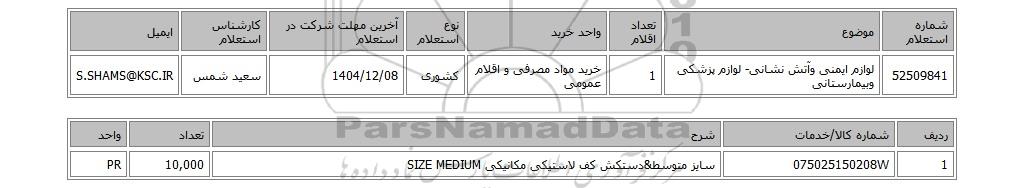 | 52509841 | لوازم ایمنی وآتش نشانی- لوازم پزشکی وبیمارستانی | 1 | خرید مواد مصرفی و اقلام عمومی | کشوری | 1404/12/08 | سعید شمس | S.SHAMS@KSC.IR |