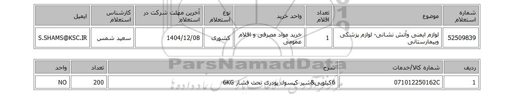 | 52509839 | لوازم ایمنی وآتش نشانی- لوازم پزشکی وبیمارستانی | 1 | خرید مواد مصرفی و اقلام عمومی | کشوری | 1404/12/08 | سعید شمس | S.SHAMS@KSC.IR |