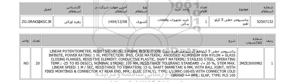 | 52507132 | پتانسیومتر خطی 5 کیلو اهم | 1 | خرید تجهیزات وقطعات یدکی | کشوری | 1404/12/08 | زهره اورکی | ZO.ORAKI@KSC.IR |