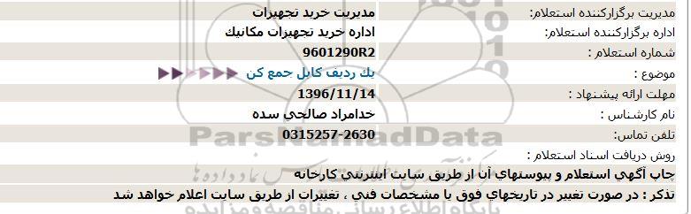 استعلام بها و موضوع استعلام استعلام,استعلام یک ردیف کابل جمع کن به اطلاع کلیه شرکتها و افراد متخصص واجد شرایط میرساند، آگهی گذار در نظر دارد از طریق استعلام بها، نسبت به انتخاب و دریافت پیشنهادات اقدام نماید. این استعلام با کد آگهی ثبت شده در سامانه خبرگزاری پارس نماد : 1039428 منتشر شده است. مشخصات استعلام : تاریخ شروع استعلام: 1396/11/09 آخرین مهلت ارسال پیشنهاد قیمت : 1396/11/14 و محل اجرای پروژه : استان اصفهان میباشد. استعلام قیمت مورد درخواست : استعلام,استعلام یک ردیف کابل جمع کن با دستهبندیهای تخصصی و گروه های مرتبط : تجهیزات برق و الکترونیک, استعلام اطلاع رسانی میگردد.