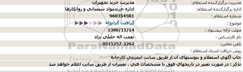 استعلام بها و موضوع استعلام استعلام، استعلام گرافیت گرانوله به اطلاع کلیه شرکت‌ها و افراد متخصص واجد شرایط می‌رساند، آگهی گذار در نظر دارد از طریق استعلام بها، نسبت به انتخاب و دریافت پیشنهادات اقدام نماید. این استعلام با کد آگهی ثبت شده در سامانه خبرگزاری پارس نماد : 1039497 منتشر شده است. مشخصات استعلام : تاریخ شروع استعلام: 1396/11/09 آخرین مهلت ارسال پیشنهاد قیمت : 1396/11/14 و محل اجرای پروژه : استان اصفهان میباشد. استعلام قیمت مورد درخواست : استعلام، استعلام گرافیت گرانوله با دسته‌بندی‌های تخصصی و گروه های مرتبط : انواع مواد و قطعات نسوز, مواد معدنی, مواد اولیه کارخانجات, استعلام اطلاع رسانی میگردد.