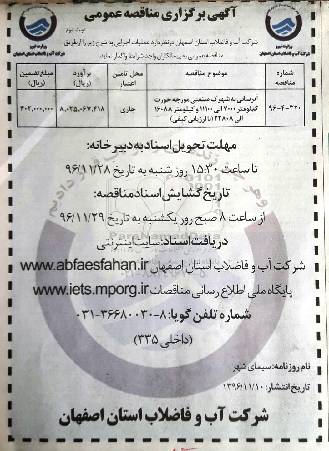 شرکت آب و فاضلاب استان اصفهان در نظر دارد عملیات اجرایی به شرح زیر را از طریق مناقصه عمومی به پیمانکاران واجد شرایط واگذار نماید.