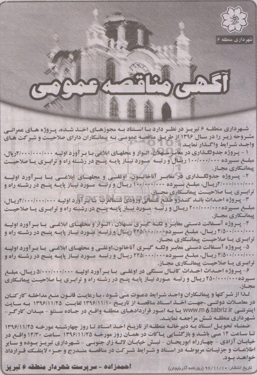 شهرداری منطقه 6 تبریز در نظر دارد با استناد به مجوزهای اخذ شده، پروژه های عمرانی مشروحه زیر را در سال 1396 از طریق مناقصه عمومی به پیمانکاران دارای صلاحیت و شرکت های واجد شرایط واگذار نماید :