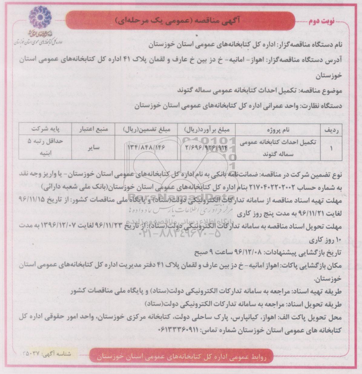 مناقصه تکمیل احداث کتابخانه عمومی - نوبت دوم, آگهی مناقصه عمومی یک مرحله ای , مناقصه تکمیل احداث کتابخانه عمومی - نوبت دوم