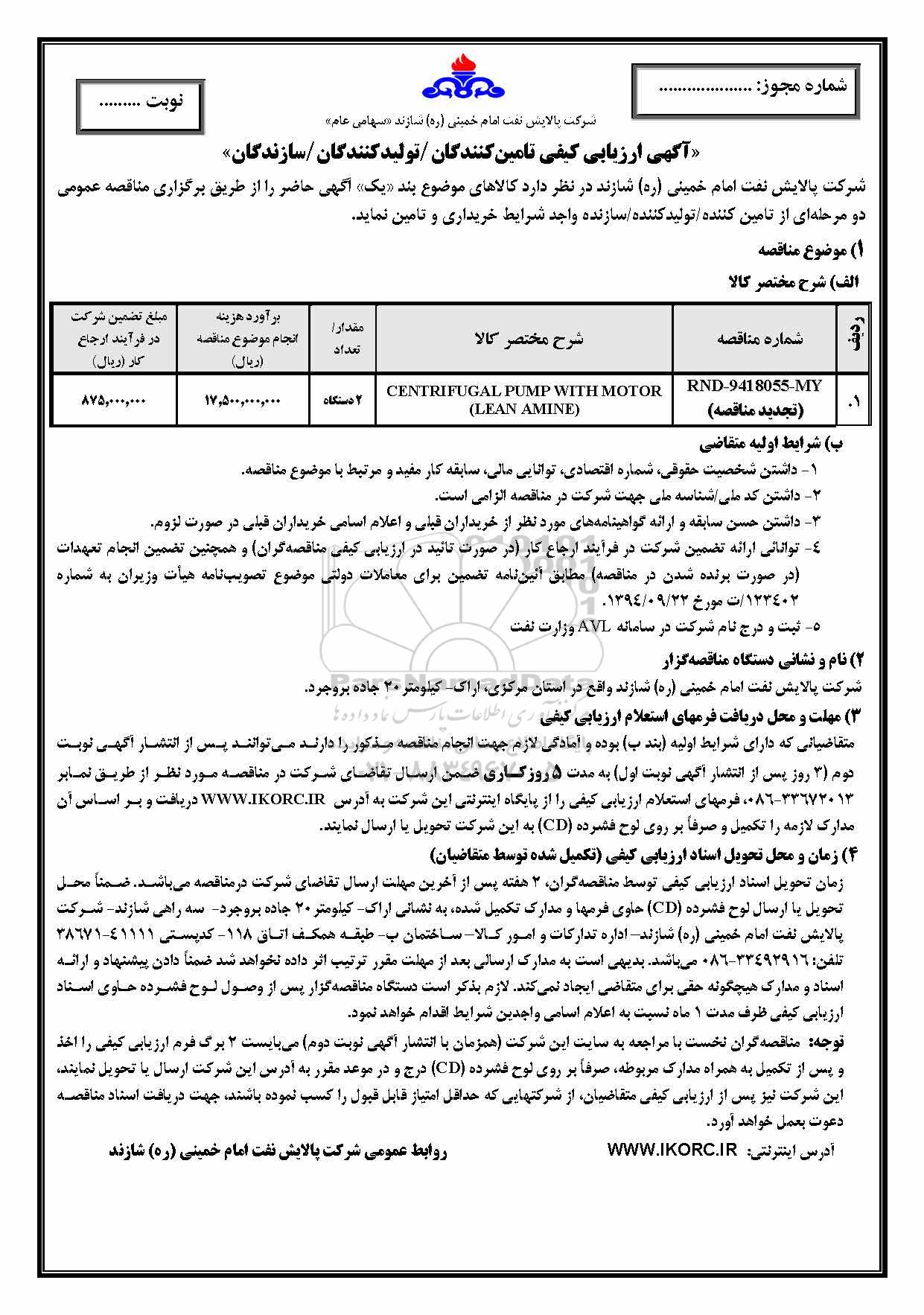 تجدید مناقصهCENTRIFUGAL PUMP WITH MOTOR LEAN AMINE از کلیه افراد متخصص و شرکتها واجد شرایط دعوت به عمل میآید در مناقصه با کد خبرگزاری پارس نماد: 1047466 شرکت نمایند.
