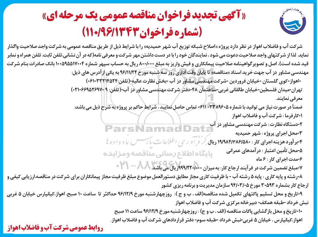 شرکت آب و فاضلاب اهواز در نظر دارد پروژه اصلاح شبکه توزیع آب شهر حمیدیه را با شرایط ذیل از طریق مناقصه عمومی به شرکت واجد صلاحیت واگذار نماید. لذا از شرکت های واجد صلاحیت دعوت می شود نمایندگان خوئد را با در دست داشتن مهر شرکت و معرفی نامه (که در آن نشانی، تلفن ثابت، تلفن همراه و نمابر قید شده است)، اصل و تصویر گواهینامه صلاحیت پیمانکاری و فیش واریز به مبلغ 800.000 ریال به حساب سپهر شماره 100595517004 بانک صادرات به نام شرکت مهندسی مشاور دز آب جهت خرید اسناد مناقصه تا پایان وقت اداری روز 3شنبه مورخ 96.11.24 به یکی از آدرس های ذیل: